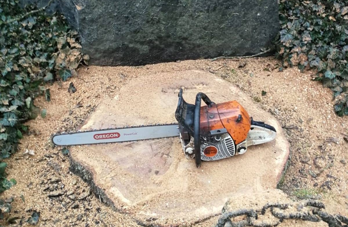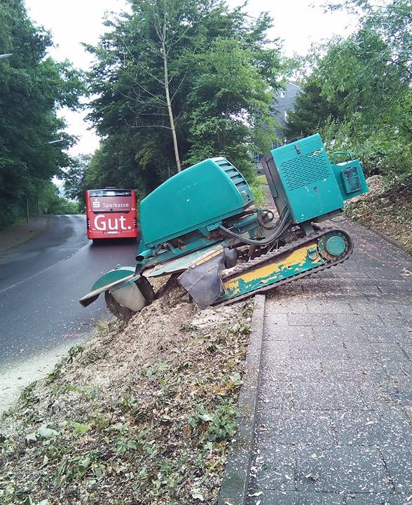 Kurzer Prozess: Wo gefräst wird, bleiben Späne! Mit der Fällung eines Baumes ist die Arbeit noch nicht erledigt, denn Äste und Stamm müssen gehäckselt und/oder entsorgt und der Baumstumpf und im Boden verbliebene Wurzelstock beseitigt werden. Hierbei kommt unsere Baumstumpffräse als echte Arbeitserleichterung zum Einsatz, denn anstatt, dass die Wurzel zeitintensiv und aufwendig ausgegraben werden muss und anschließend zu entsorgen, wird der Stumpf weggefräst: Ein rotierender Fräskopf trägt den Baumstumpf schichtweise ab.
